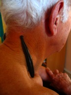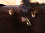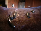 Nach einer Fellrasur um die vorgesehene Bißstelle wird die Haut mit einer Nadel angeritzt, damit ein Tropfen Blut austritt - die Egel beissen dann besser und an der Stelle, die ich mir vorstelle (meine Methode, andere Therapeuten lassen die Blutegel die Bißstelle selbst aussuchen, oder arbeiten mit Honigwasser) .
